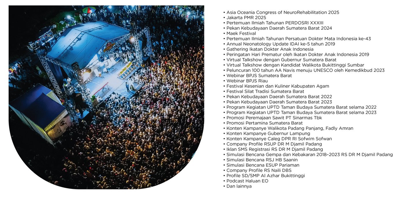 Kami mengelola beragam jenis acara, mulai dari event medis, pameran, simposium, workshop, hingga pertunjukan seni dan budaya, dengan komitmen terhadap kualitas, detail, dan pengalaman yang berkesan.